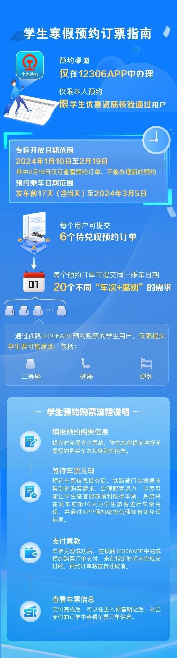 為認真貫徹落實黨中央國務院關(guān)于做好2024年元旦春節(jié)期間有關(guān)工作的要求,保障學生、務工人員等重點群體春運出行,鐵路12306創(chuàng)新服務舉措,為學生、務工人員推出了售票服務專區(qū)。自1月10日起,符合條件的學生旅客(已通過學生優(yōu)惠資質(zhì)核驗且有剩余優(yōu)惠乘車次數(shù))可通過“學生寒假訂票專項服務”專區(qū)預約購買春運期間(1月26日至3月5日)火車票,每名旅客最多可同時提交6個預約訂單,每個訂單可添加1個乘車日期的20個“車次+席別”的組合,可選席別為學生優(yōu)惠票適用的硬座、硬臥、二等座。已通過實名制核驗的務工人員可通過“務工人員春運預約訂票服務”專區(qū)預約購買春運期間火車票,每名旅客可同時提交6個預約訂單,每個訂單可選擇“時間+車次+席別”的1個組合。