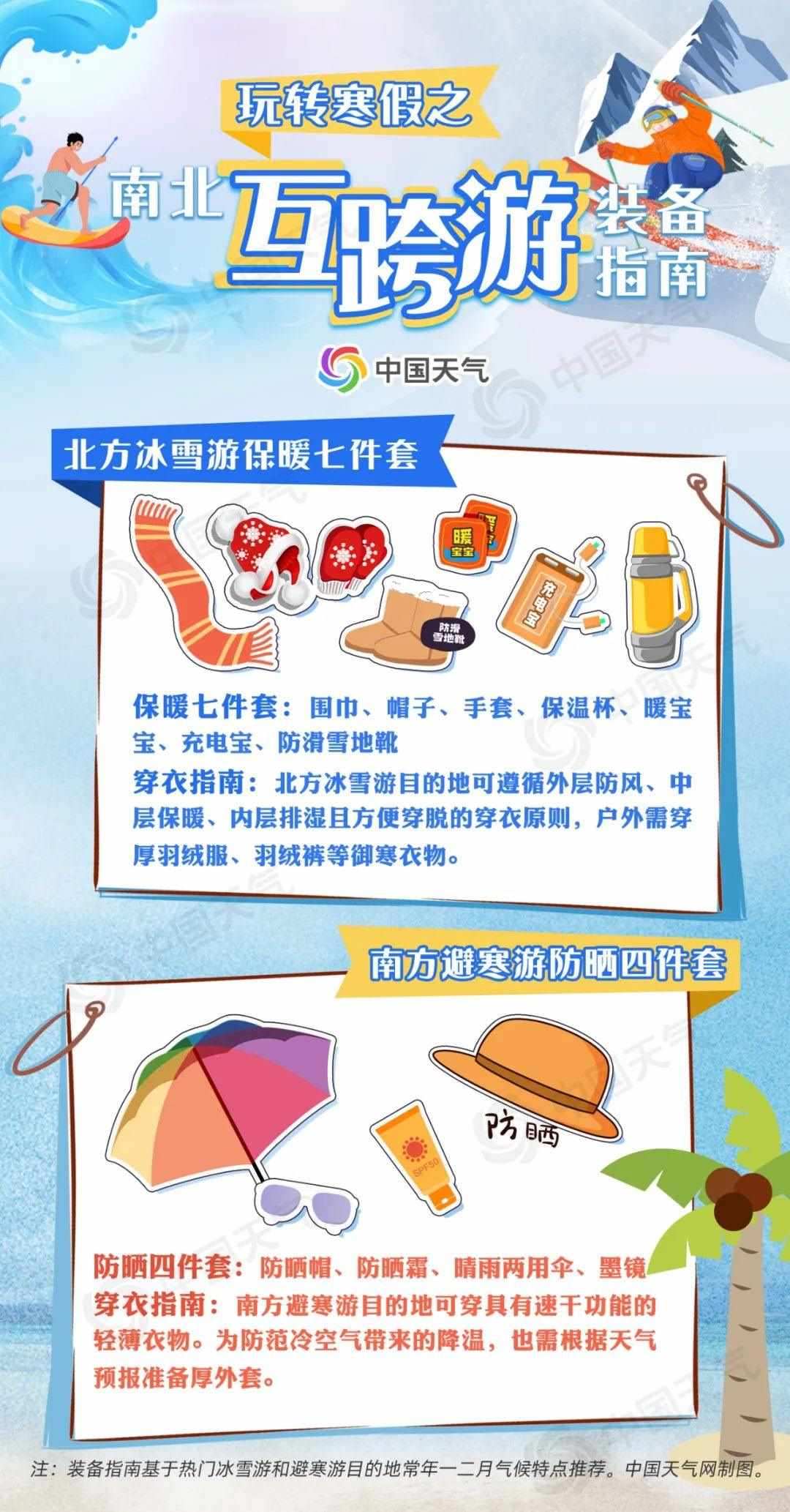 無論是北上戲冰雪,還是南下避寒游,裝備是否齊全直接關(guān)系到旅游行程的質(zhì)量。對于前往北方冰雪游的朋友來說,防寒保暖至關(guān)重要;南下避寒則要注意防曬防蚊。