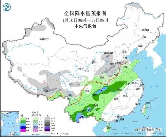 1月16日08時(shí)至17日08時(shí),新疆北疆北部、內(nèi)蒙古中部偏南地區(qū)、西藏中東部、青海南部、川西高原、陜西、山西、河北南部、河南西部和北部、山東西部、湖北西北部、云南西北部等地的部分地區(qū)有小到中雪或雨夾雪,其中云南西北部等地局地有大到暴雪;西南地區(qū)東部、黃淮南部、江漢、江淮、江南西部、云南、廣西西部等地有小到中雨,其中重慶中東部、湖北西南部、貴州西南部、云南南部等地的部分地區(qū)有大雨,局地暴雨(50~60毫米)。浙江北部和東部、西藏等地的部分地區(qū)有4~6級(jí)風(fēng);臺(tái)灣海峽有6~7級(jí)、陣風(fēng)8級(jí)的東北風(fēng)(見(jiàn)圖2)。