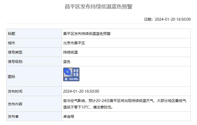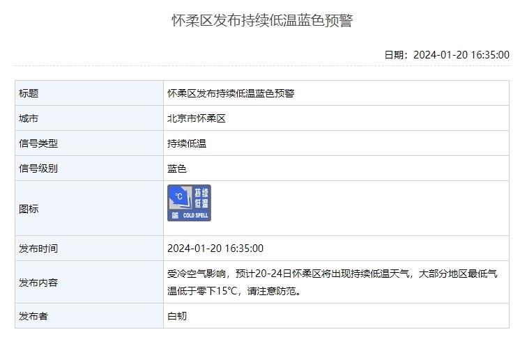 北京3區(qū)發(fā)布持續(xù)低溫藍色預警 延慶、懷柔兩地大部分地區(qū)氣溫低于-15℃