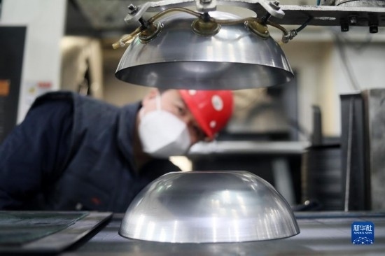 12月21日,在位于隆堯縣的河北三廈廚具科技有限公司生產(chǎn)車間,工人在操控旋壓設(shè)備。