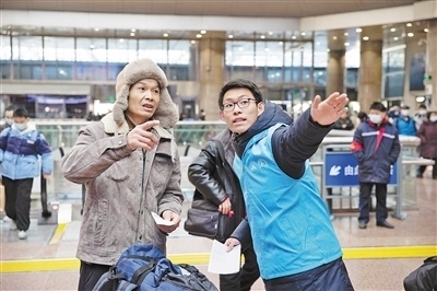 春運首日,北京西站內(nèi),中國鐵路北京局志愿者為旅客進行引導(dǎo)。本報記者 張武軍攝