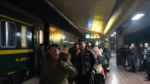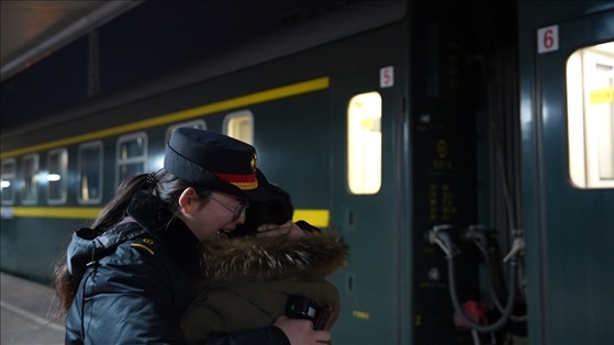 14號(hào)車廂內(nèi),來(lái)自黑龍江省齊齊哈爾市泰來(lái)縣的王興海和陳玉倩望著車窗外、站臺(tái)上的王靚怡,喜笑顏開(kāi)。跨越2700多公里、歷時(shí)52個(gè)小時(shí),只為給女兒一個(gè)驚喜,陪她在崗過(guò)年。