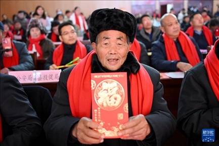 2月1日,在鳳陽縣小崗村,“大包干”帶頭人嚴金昌展示自家領(lǐng)取的分紅紅包。新華社記者 黃博涵 攝