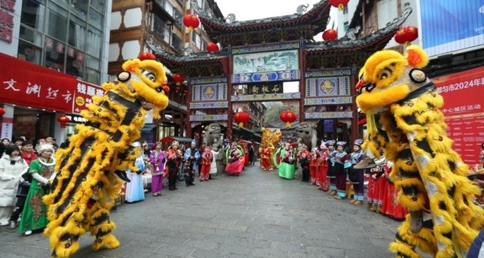 各地舉辦豐富多彩的民俗展演活動(dòng)慶新春,人們在貴州省黔南布依族苗族自治州都勻市石板街觀看舞獅表演。