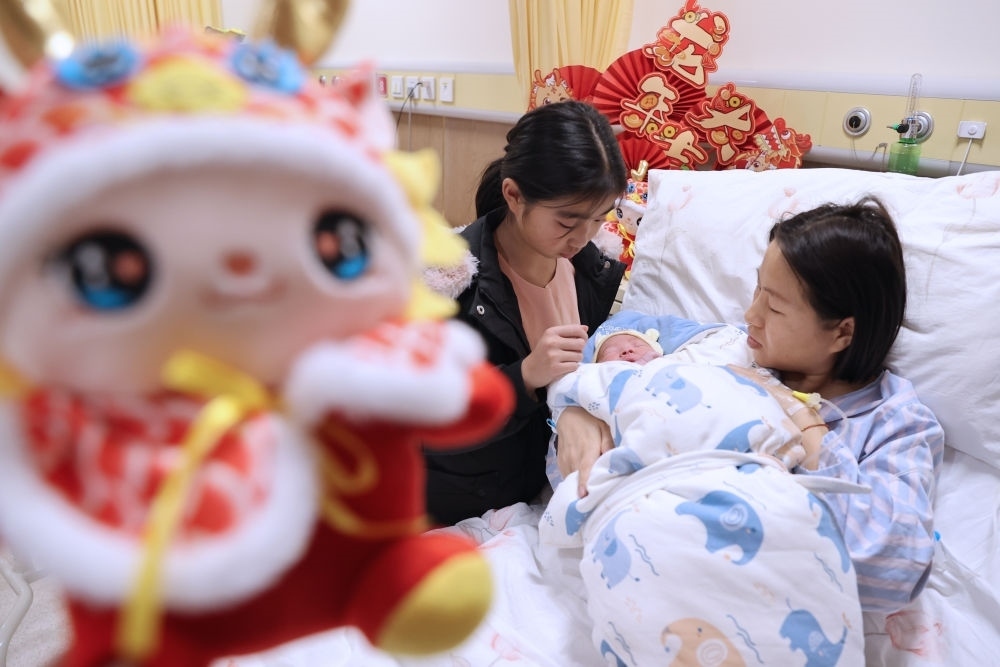 2月10日,在河北省石家莊市婦產(chǎn)醫(yī)院,一名剛出生的“龍寶寶”躺在媽媽懷里。新華社發(fā)(陳其保 攝)