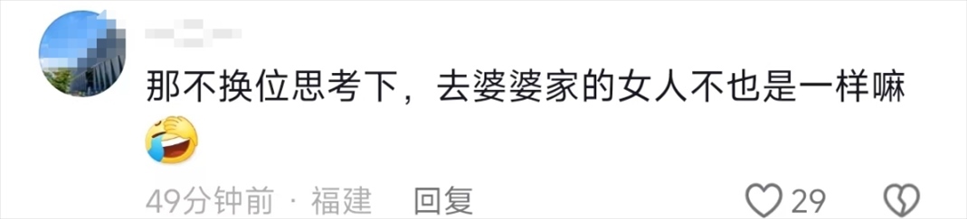 還有網(wǎng)友表示,這個時候,女婿更應(yīng)該能過體諒媳婦在婆家過年的難處了,大家過年要互相體諒,換位思考。
