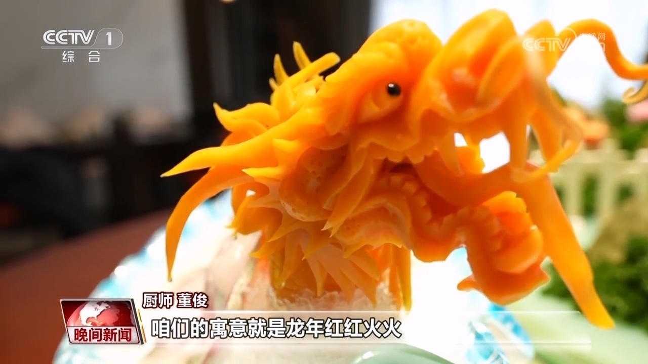 廚師 董?。?/strong>把魚切成薄片,用濃湯涮熟,擺盤呈現(xiàn)一條龍的造型,咱們的寓意就是龍年紅紅火火、風(fēng)調(diào)雨順、年年有余。