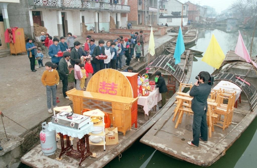 1990年春節(jié)前夕,紹興紅江村的章如花嫁到了一里外的檀瀆村。新郎迎娶新娘所用的交通工具,不是汽車,也不是花轎,而是水鄉(xiāng)里常見的船。富裕起來的水鄉(xiāng)農(nóng)民在遵循傳統(tǒng)禮儀的同時,也為婚禮增添了現(xiàn)代色彩。比如,陪嫁中少不得電視、煤氣罐;新娘少不得燙發(fā);另一件少不得的,是用攝像機記錄下婚禮的全部過程,作為一輩子的紀念。