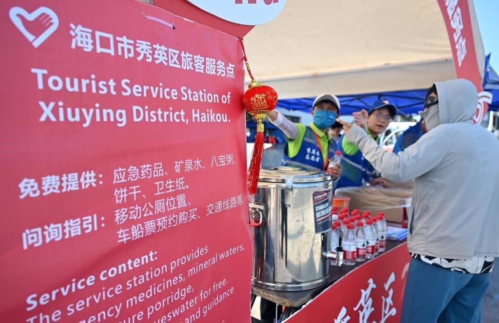 記者在新海港附近一處旅客服務(wù)點看到,幾位志愿者在向旅客發(fā)放免費(fèi)礦泉水和餅干。