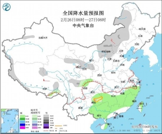 全國降水量預(yù)報圖(2月26日08時-27日08時)