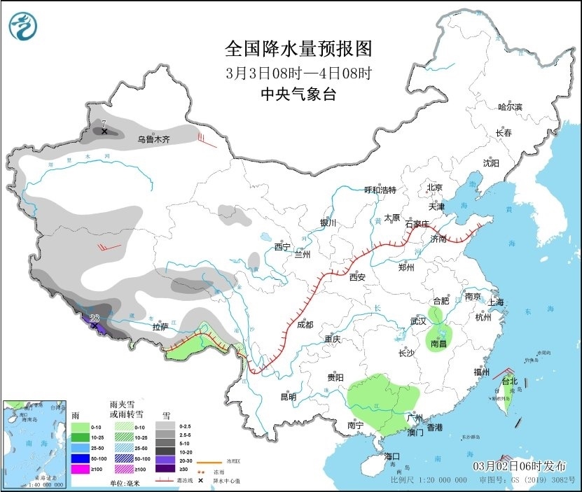 圖1 全國降水量預報圖(3月2日08時-3日08時)