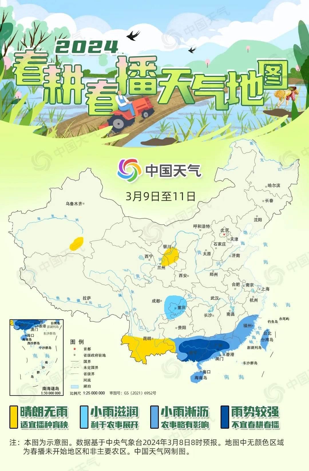 目前,我國春播區(qū)域主要集中在華南,以早稻為主;西南、西北部分地區(qū)也已開始春播,以馬鈴薯、春小麥等為主。明天開始,華南春播區(qū)將迎來一場較強(qiáng)降雨,將對當(dāng)?shù)氐脑绲静シN育秧有明顯影響。