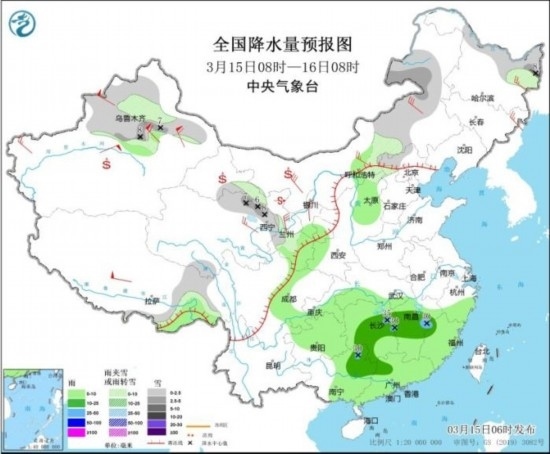 3月15日08時至16日08時,新疆北部、青海北部、甘肅、內蒙古東部、黑龍江北部、河北西北部等地部分地區(qū)有小到中雪或雨夾雪,其中,新疆沿天山地區(qū)、青海東北部、黑龍江東北部等地部分地區(qū)有大雪(5~8毫米)。甘肅南部、寧夏南部、陜西西南部、湖北南部、湖南、江西大部、重慶東部、貴州大部、華南大部等地部分地區(qū)有小到中雨,其中,湖南東北部、江西中部、廣西東北部等地部分地區(qū)有大雨(25~35毫米)。新疆北部、青海東部、甘肅、內蒙古大部、黑龍江東部、吉林東部等地部分地區(qū)有4~6級風,其中,新疆伊犁河谷和沿天山地區(qū)等地有8~9級風,山口風力可達10~11級。新疆東部和南部、內蒙古西部、青海西北部、甘肅中西部、寧夏、陜西北部等地的部分地區(qū)有揚沙或浮塵天氣,內蒙古西部、甘肅中部局地有沙塵暴。