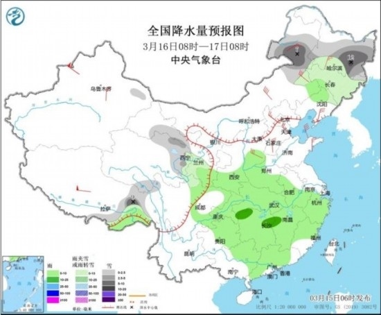全國降水量預報圖(3月15日08時-16日08時)。圖片來源:中央氣象臺網站
