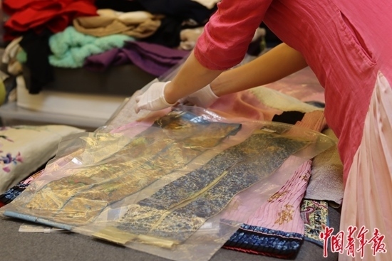 工作人員整理畢紅珍藏的清代宮廷服裝和繡品。中青報·中青網記者 余冰玥/攝