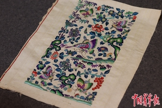 畢紅珍藏的清代宮廷繡品,鳳蝶寓意“喜相逢”。中青報·中青網記者 余冰玥/攝