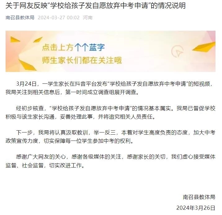 央視網(wǎng)消息:南召縣教體局3月27日發(fā)布《關(guān)于網(wǎng)友反映“學(xué)校給孩子發(fā)自愿放棄中考申請(qǐng)”的情況說明》。