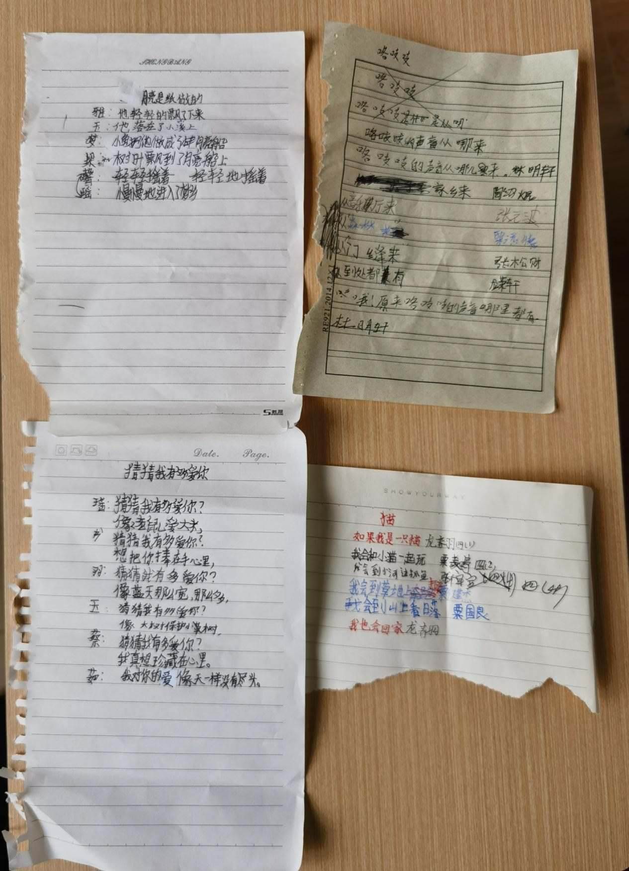 11歲的龍夢(mèng)瑤是詩(shī)班里高產(chǎn)的一個(gè)。她在本子上擠擠挨挨寫一團(tuán)字,一把撕下整頁(yè),塞給李柏霖。這樣的紙片,李柏霖一天要收到幾十張。大大小小夾在書里,她晚上批改完,第二天再拿回學(xué)校,在課堂上分享。她估計(jì),孩子們寫的詩(shī)已經(jīng)超過(guò)2000首。