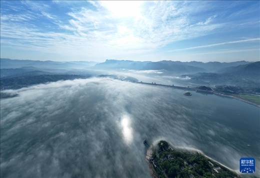 當日,雨過天晴的三峽大壩及附近水域上空云霧繚繞,美景如畫。