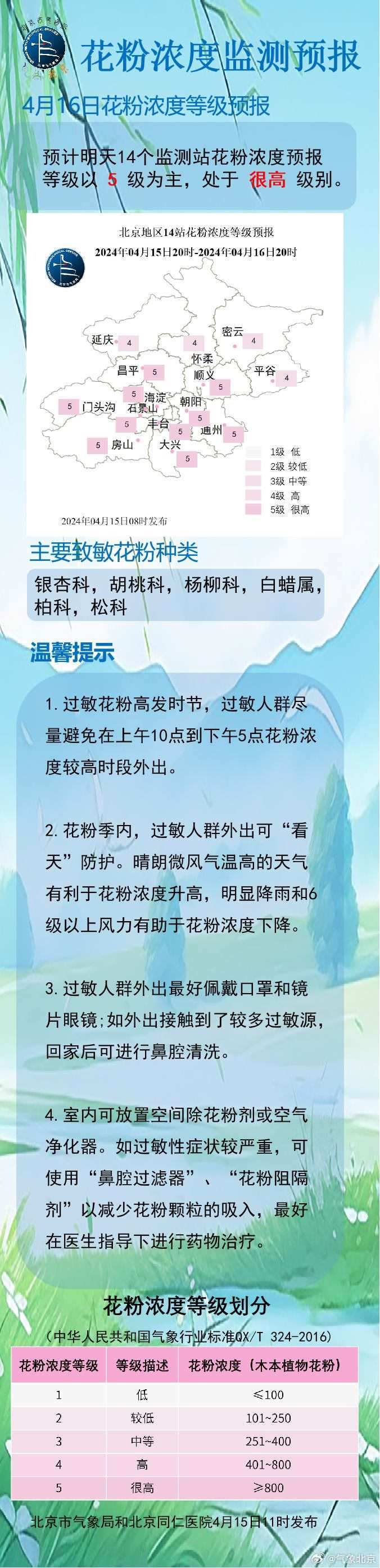 央視網(wǎng)消息:@?氣象北京 發(fā)布花粉實況及花粉濃度預報,昨日(4月14日)北京6站大部花粉濃度等級為4級。目前本市主要致敏花粉種類為銀杏科、胡桃科、楊柳科,白蠟屬,柏科,松科等。預計4月15日14站花粉濃度以5級為主,為很高級別(>800)。今天有大風沙塵天氣,大部分地區(qū)花粉濃度為很高級別,敏感人群外出需注意做好健康防護。