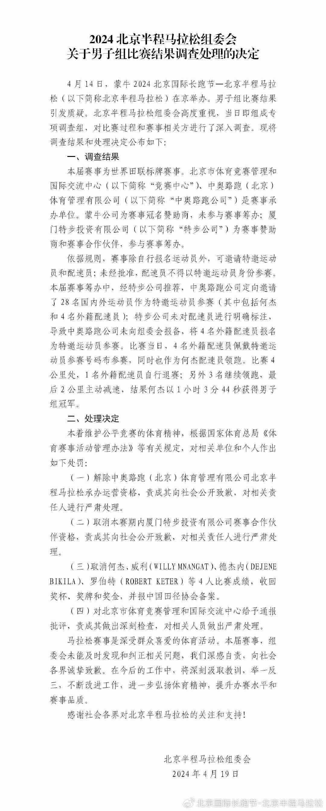 央視網(wǎng)消息:據(jù)@北京國際長跑節(jié)-北京半程馬拉松 微博消息,2024北京半程馬拉松組委會(huì)發(fā)布關(guān)于男子組比賽結(jié)果調(diào)查處理的決定。詳情如下: