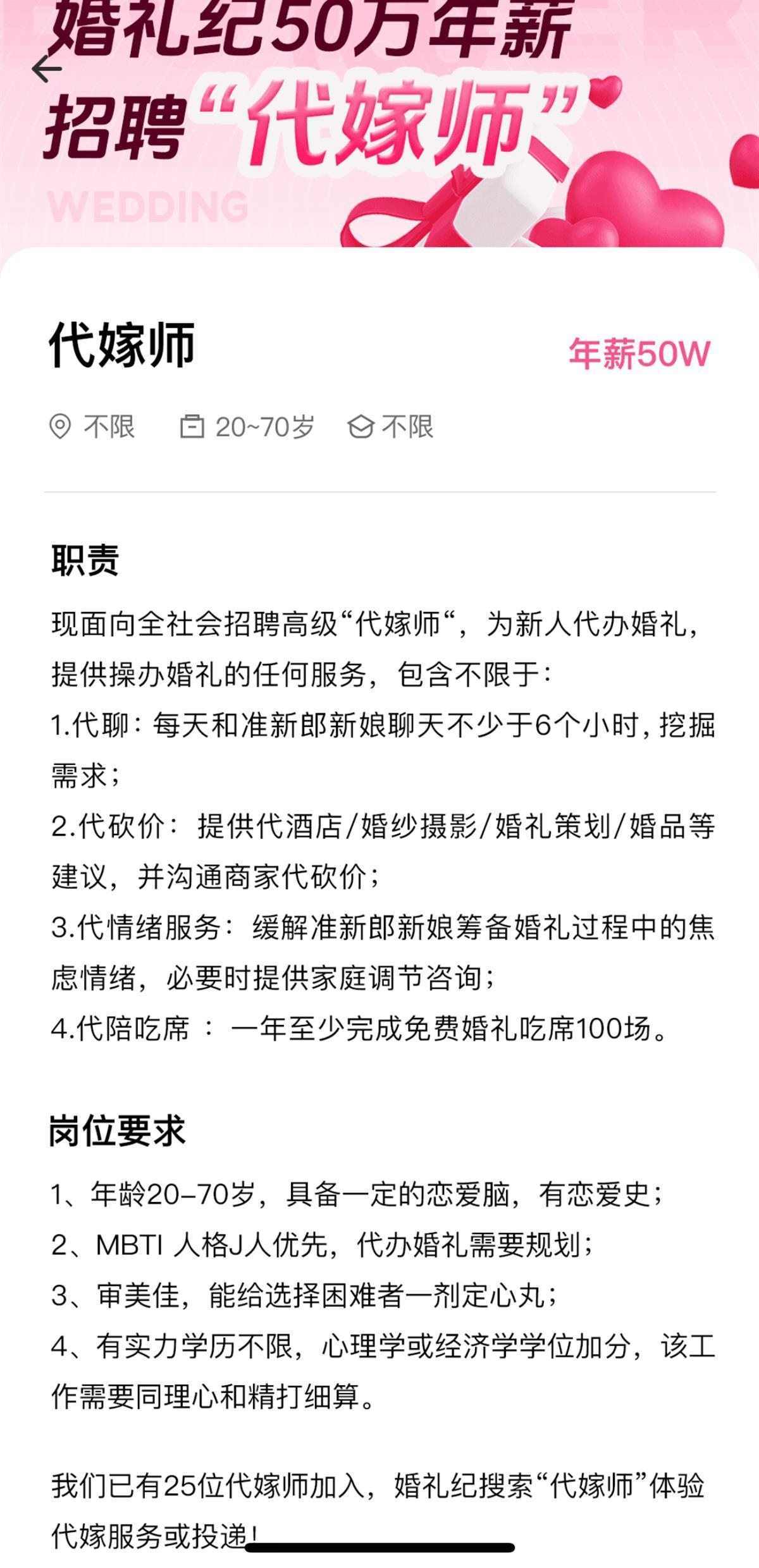 該招聘信息還顯示,目前,平臺(tái)已有25位代嫁師加入。