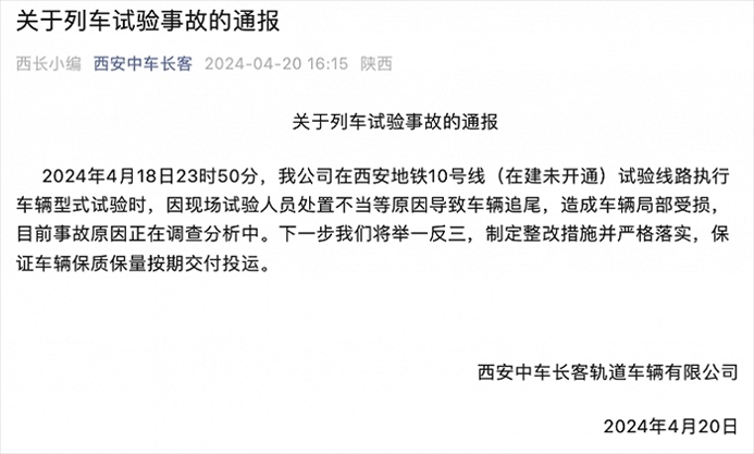 央視網(wǎng)消息:據(jù)西安中車長客官微消息,西安中車長客軌道車輛有限公司4月20日通報(bào),4月18日23時(shí)50分,公司在西安地鐵10號線(在建未開通)試驗(yàn)線路執(zhí)行車輛型式試驗(yàn)時(shí),因現(xiàn)場試驗(yàn)人員處置不當(dāng)?shù)仍驅(qū)е萝囕v追尾,造成車輛局部受損,目前事故原因正在調(diào)查分析中。下一步將舉一反三,制定整改措施并嚴(yán)格落實(shí),保證車輛保質(zhì)保量按期交付投運(yùn)。