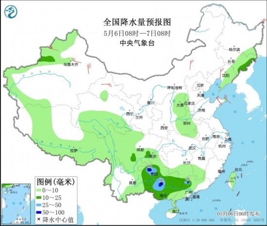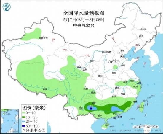 全國(guó)降水量預(yù)報(bào)圖(5月6日08時(shí)-7日08時(shí))