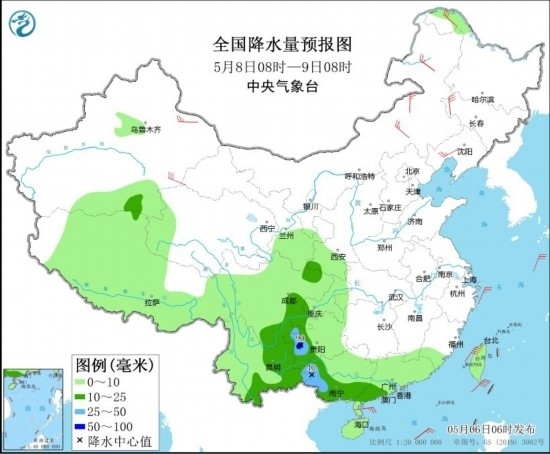 全國(guó)降水量預(yù)報(bào)圖(5月8日08時(shí)-9日08時(shí))