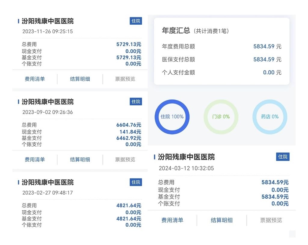 上圖是在國家醫(yī)保報(bào)銷平臺(tái)上查詢到的某位五保老人在殘康中醫(yī)醫(yī)院的醫(yī)保報(bào)銷記錄,2023年住院3次,2024年春季住院1次。(拼板照片)新華社發(fā)(楊哲攝)