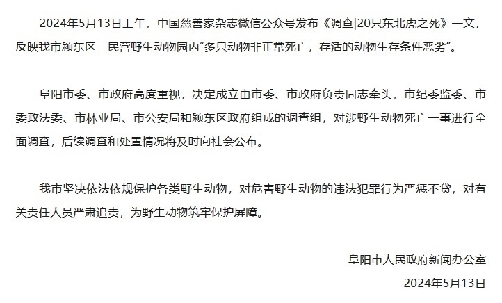 央視網(wǎng)消息:據(jù)“阜陽(yáng)發(fā)布”微信公眾號(hào)消息,阜陽(yáng)市人民政府新聞辦公室發(fā)布情況通報(bào),2024年5月13日上午,中國(guó)慈善家雜志微信公眾號(hào)發(fā)布《調(diào)查|20只東北虎之死》一文,反映阜陽(yáng)市潁東區(qū)一民營(yíng)野生動(dòng)物園內(nèi)“多只動(dòng)物非正常死亡,存活的動(dòng)物生存條件惡劣”。
