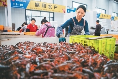 近日,工作人員在湖北省潛江市中國小龍蝦交易中心分揀小龍蝦。新華社記者 伍志尊攝