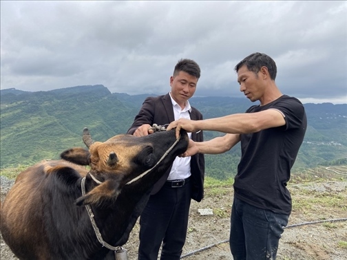 楊勝?gòu)?qiáng)(左)同養(yǎng)殖戶一起查看牛的年齡(2022年10月13日攝)。新華社發(fā)(張倩秋 攝)