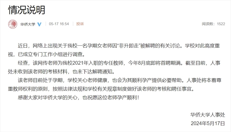 ·孕期女老師因“非升即走”被解聘?華僑大學(xué)回應(yīng):未下達解聘通知。