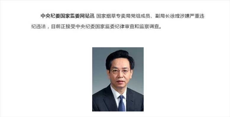 ·國(guó)家煙草專賣局黨組成員、副局長(zhǎng)接受中央紀(jì)委國(guó)家監(jiān)委紀(jì)律審查和監(jiān)察調(diào)查。