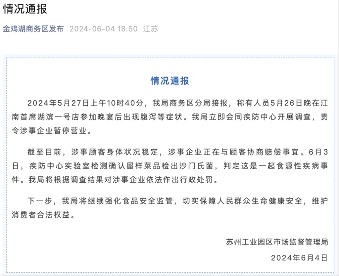 央視網(wǎng)消息:據(jù)蘇州工業(yè)園區(qū)市場(chǎng)監(jiān)督管理局通報(bào),5月27日上午10時(shí)40分,商務(wù)區(qū)分局接報(bào),稱有人員5月26日晚在江南首席湖濱一號(hào)店參加晚宴后出現(xiàn)腹瀉等癥狀。該局立即會(huì)同疾防中心開展調(diào)查,責(zé)令涉事企業(yè)暫停營(yíng)業(yè)。