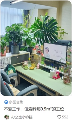 國家二級心理咨詢師于光瑞分析道:“工位是職場人在單位的‘自留地’,在不太影響辦公室整體形象的情況下,工位裝飾可以彰顯自己獨(dú)特的個性、喜好和品味。”