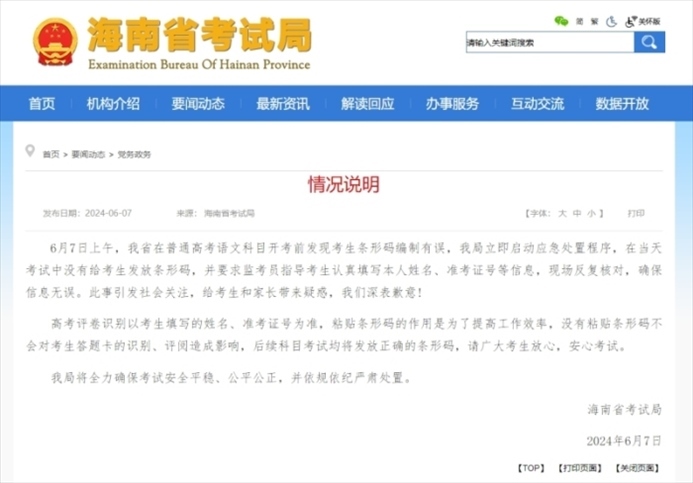 ·海南通報(bào)“高考語(yǔ)文卷未發(fā)條形碼”:不影響答題卡識(shí)別、評(píng)閱。