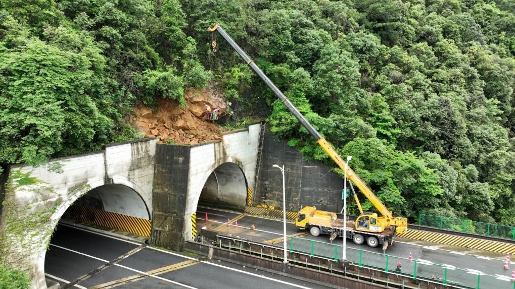 6月12日,南平高速公路養(yǎng)護部門工作人員在清理隧道頂部松動的碎石。(受訪者供圖)