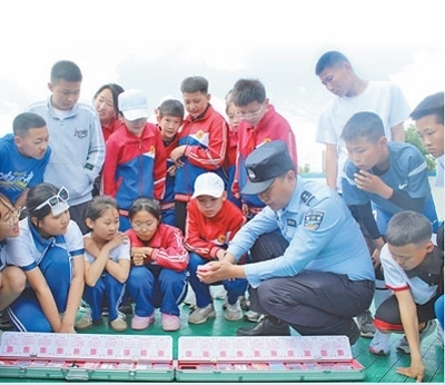 內(nèi)蒙古自治區(qū)通遼市科爾沁左翼后旗公安局禁毒大隊(duì)民警走進(jìn)該旗蒙古族實(shí)驗(yàn)小學(xué),向?qū)W生們展示“笑氣”模型。周連龍攝