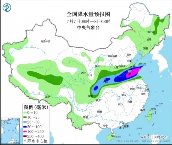 7月7日08時至8日08時,陜西中南部、黃淮大部等地部分地區(qū)有大到暴雨,其中,山東中東部和南部等地部分地區(qū)有大暴雨,山東南部等地局地特大暴雨(250~280毫米)。內蒙古中部部分地區(qū)有4~5級風。