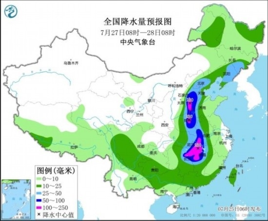 全國降水量預(yù)報圖(7月25日08時-26日08時)