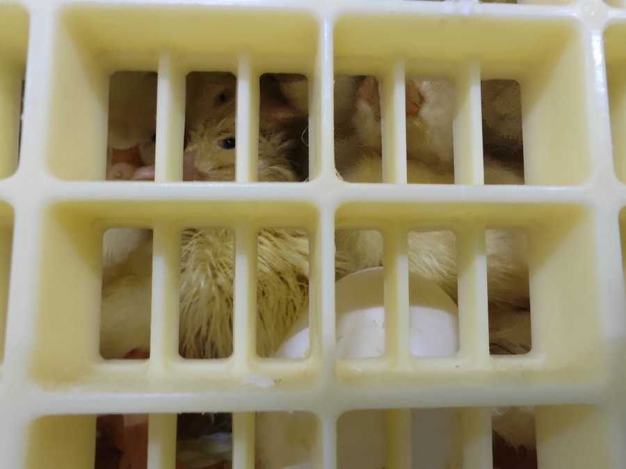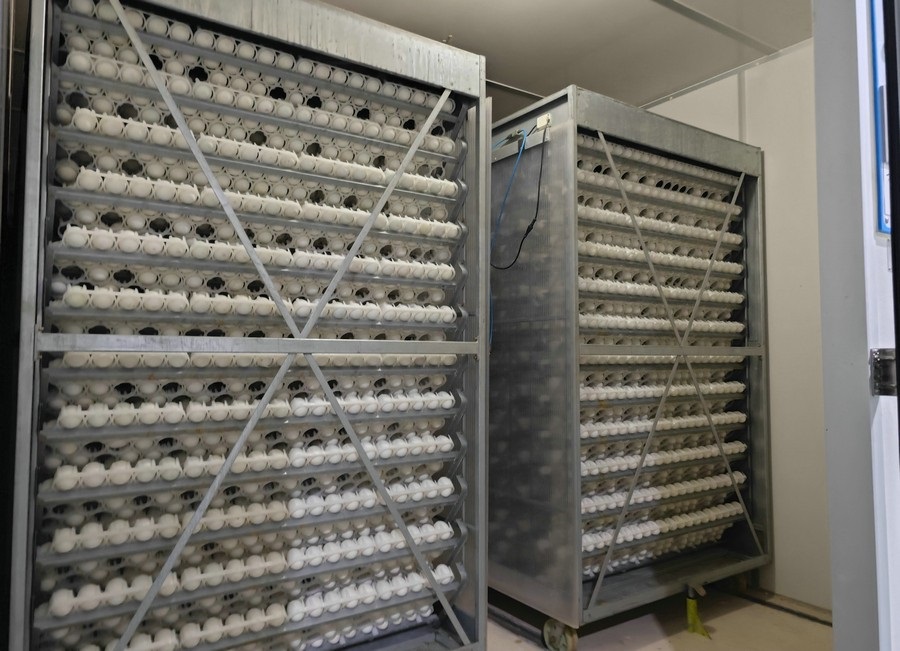 選蛋、稱重、儲蛋、洗蛋、孵化、落盤、出雛、出苗……經過一系列程序,并經過25天的孵化后,種蛋由孵化車轉移到出雛筐,在此等待3天,就完成了由蛋到苗的蛻變。