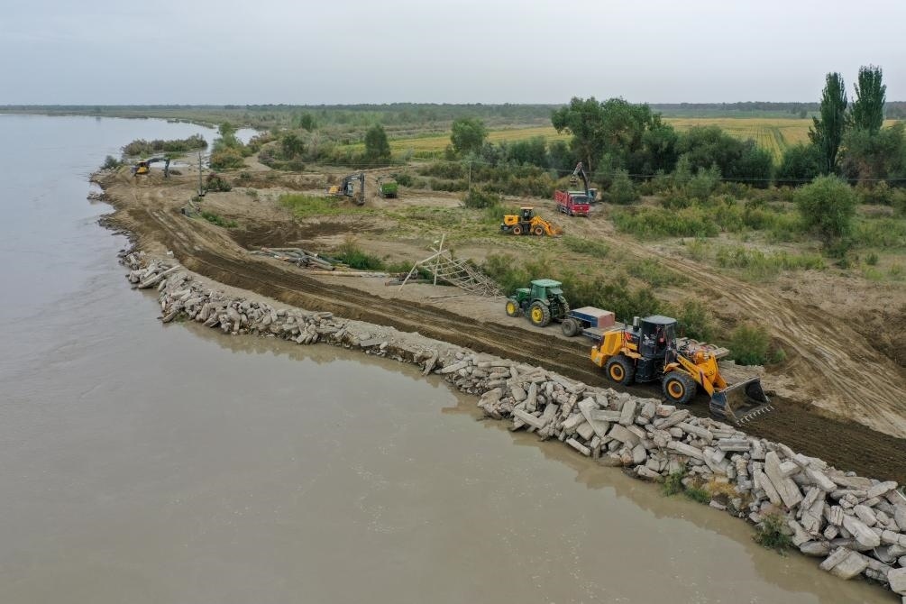 “這一區(qū)域是‘幾’字形的回水灣,距離最近的農(nóng)田不足50米?!鄙w孜庫木鄉(xiāng)黨委書記艾力江·阿布來提說,為確保群眾生命財產(chǎn)安全,當(dāng)?shù)剜l(xiāng)村兩級干部和黨員共230人組成7支搶險隊,輪流值守防汛一線,并投入35輛大型機(jī)械進(jìn)行堤壩除險加固。