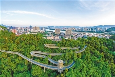 生態(tài)道福建福州市在建設(shè)“福道”時,采取鋼結(jié)構(gòu)高架、鏤空橋面棧道、節(jié)點大跨度橋梁等創(chuàng)新設(shè)計,最大限度保護(hù)森林原生態(tài)。林雙偉攝(人民視覺)