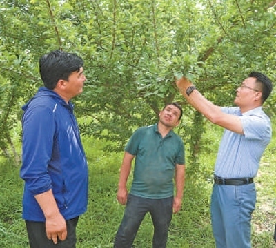 徐學(xué)彬(右一)與種植戶查看果樹掛果情況。塔依爾·艾力攝