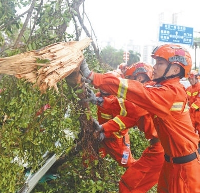 9月7日,海南省??谑泄ぷ魅藛T在??谑袨I海大道上清理被風(fēng)吹倒的樹木。新華社記者 楊冠宇攝