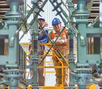 國網(wǎng)南京供電公司員工與南瑞集團工作人員在變電站查看設(shè)備狀態(tài)。杜 懿攝