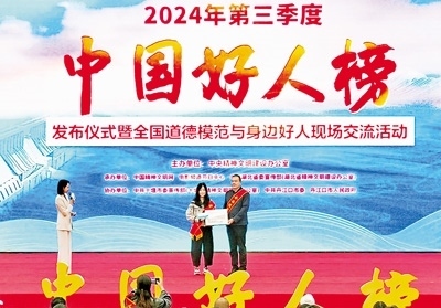 30多年堅守海上救援的“漁家子弟”董建海,數(shù)九寒天跳入冰窟救人獻(xiàn)出生命的普通村民高元嶺,自愿守護(hù)烈士英靈43載的退伍老兵顧平,犧牲在防汛一線的90后基層干部李東,21年不離不棄照料患病親人的好兒媳王秀杰……11月12日,由中央精神文明建設(shè)辦公室主辦的2024年第三季度“中國好人榜”發(fā)布儀式暨全國道德模范與身邊好人現(xiàn)場交流活動在湖北省十堰市舉辦,經(jīng)各地推薦、網(wǎng)友評議和專家評審等環(huán)節(jié),共有152人(組)助人為樂、見義勇為、誠實守信、敬業(yè)奉獻(xiàn)、孝老愛親身邊好人光榮上榜。